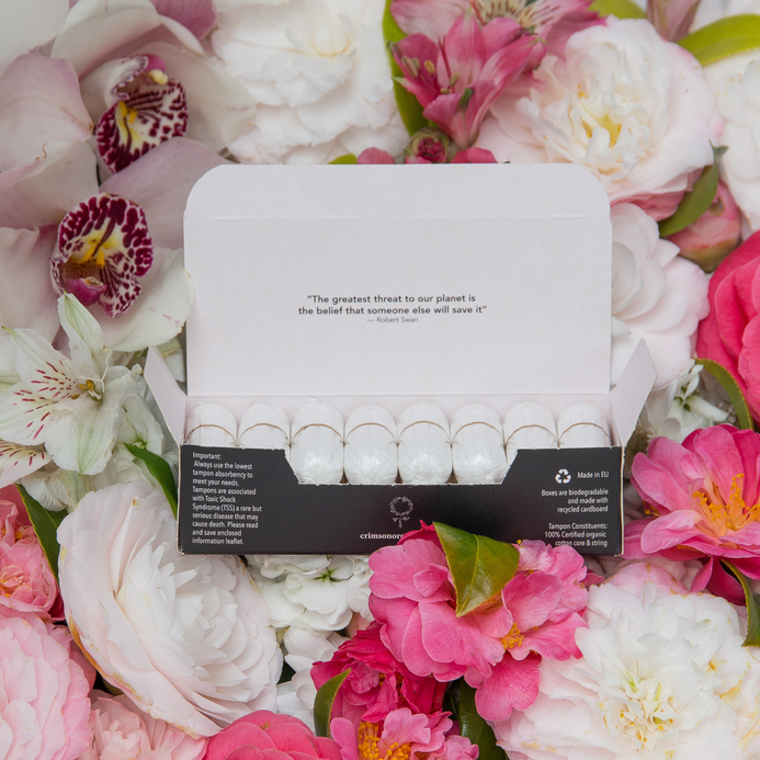 Most conventional tampons contain plastics and chemical residues. Crimson tampons are made from pure organic cotton—biodegradable, toxin-free, and better for both bodies and the environment.