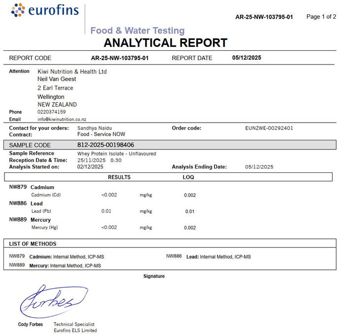 Kiwi Nutrition Whey Protein Isolate is 100% pure grass fed NZ whey protein isolate. It is refined from milk produced right here in NZ and then delivered direct to you with absolutely nothing added. It has a clean, natural taste which makes it highly versatile - it can be added to your favourite smoothies or baking without changing the flavour.