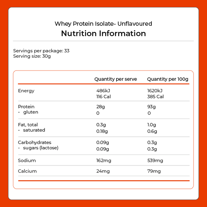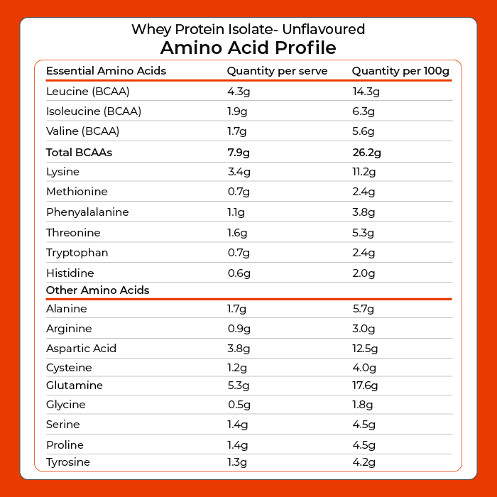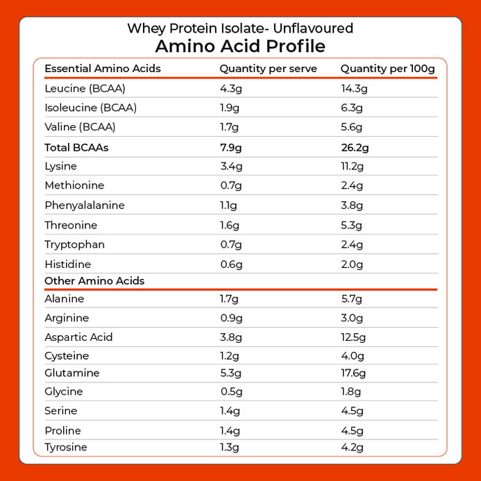 Our unflavoured whey protein isolate offers an impressive 28 grams of protein with 8 grams of branch chain amino acids (BCAAs) and 5.3 grams of glutamine per 30 gram serving.