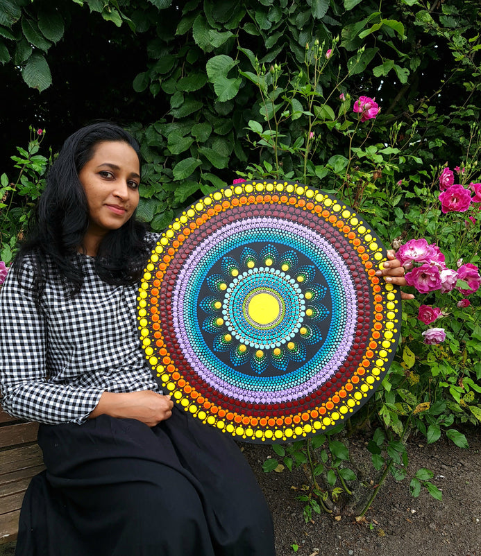 Mandala paintings is a symbolic picture of the universe, this dot mandala painting represents everything is one, symbol of the UN-manifested. Mandala is famously known as a spiritual and ritual symbol in many Asian culture. Mandalas, meaning "circles" in Sanskrit, are sacred symbols that are used for meditation, prayer, healing and art therapy for both adults and children. Mandalas have been shown in clinical studies to boost the immune system, reduce stress and pain, lower blood pressure, promote sleep and ease depression.