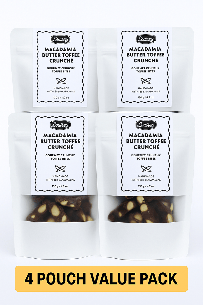 Order your 4-pack value bundle of Lowrey Macadamia Butter Toffee Crunché today and experience the perfect harmony of real ingredients, artisan craftsmanship, and world-class flavour — made in New Zealand, delivered worldwide.