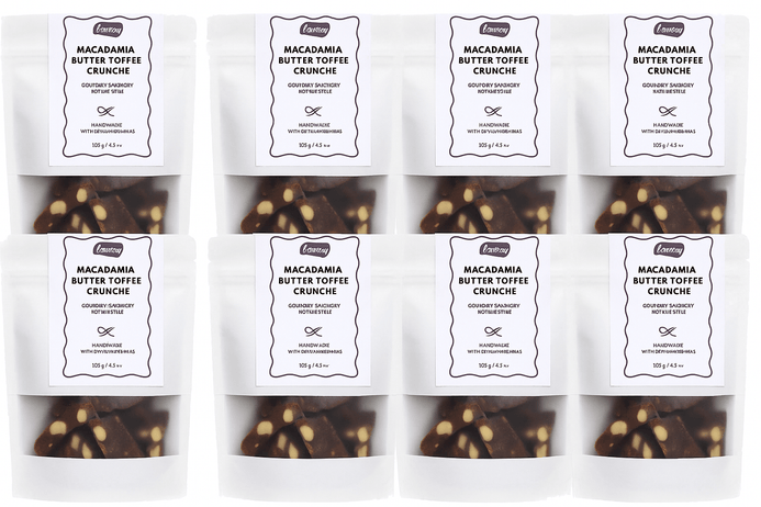 Get your hands on 8 pouches of our bestselling Macadamia Butter Toffee Crunché, handcrafted in small batches with 38% whole macadamia nuts and slow-cooked butter toffee. Whether you're buying for family, sharing with friends, or stocking up for gifts — this special value pack offers unbeatable savings for true toffee lovers.